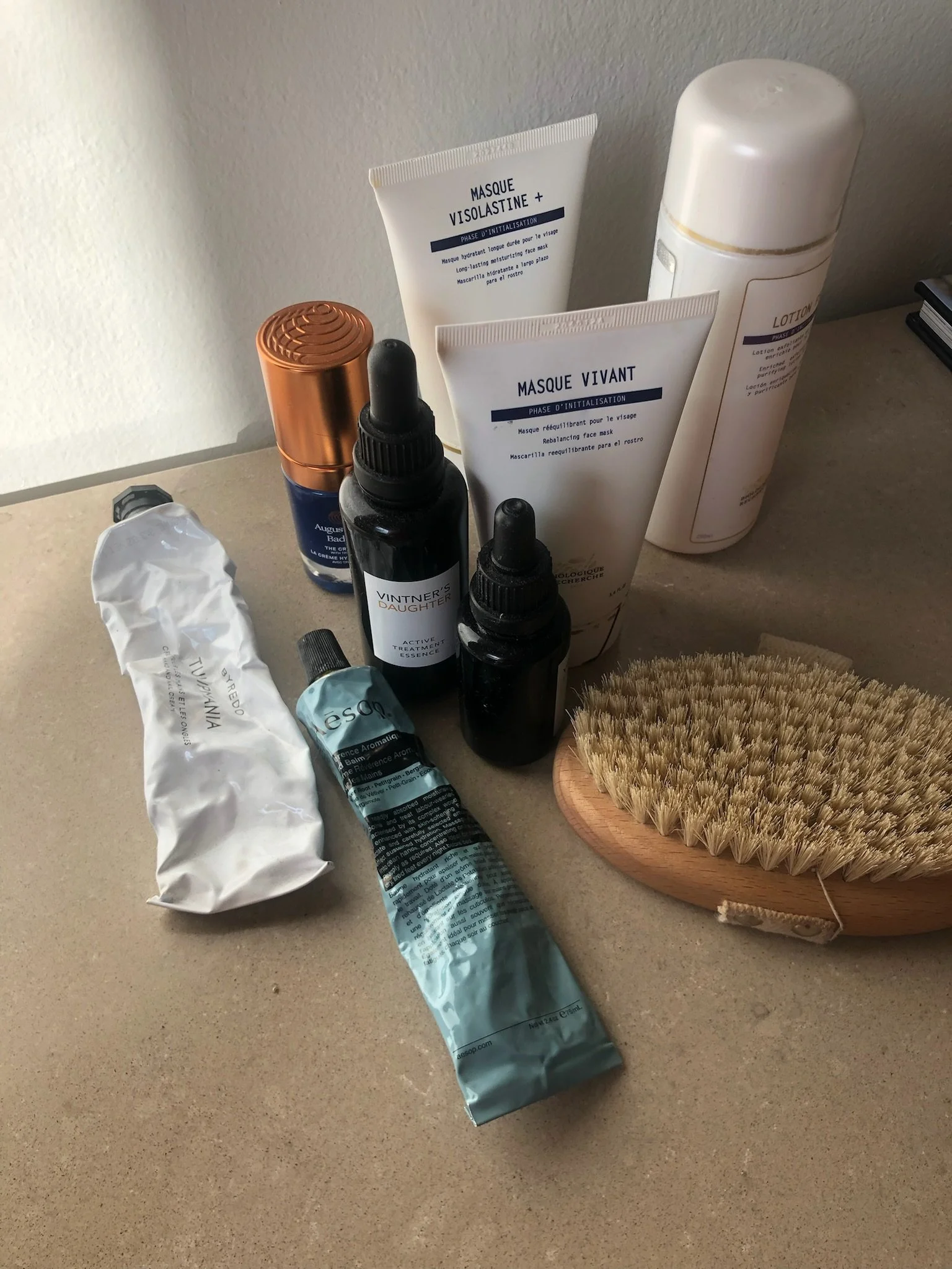 Biologique Recherche P50, Biologique Recherche Masque Vivant, Biologique Recherche Masque Visolastine +, Augustinus Bader The Cream, Vintner’s Daughter Active Botanical Serum, Vintner’s Active Treatments Essence.